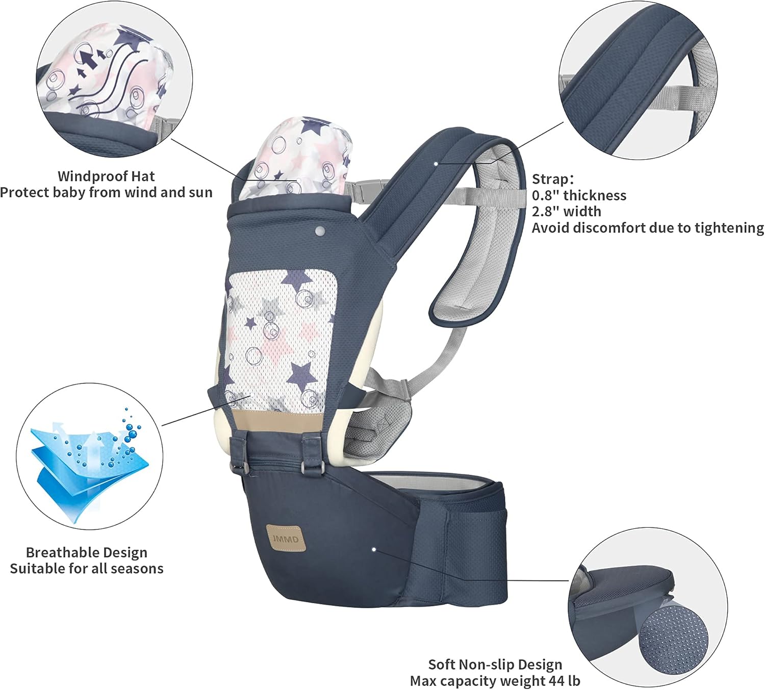 Ergonomic design distributes weight evenly throughout your lower back and shoulders. The hip seat base is intentionally built wide enough so that your baby’s hips rest in a healthy position.